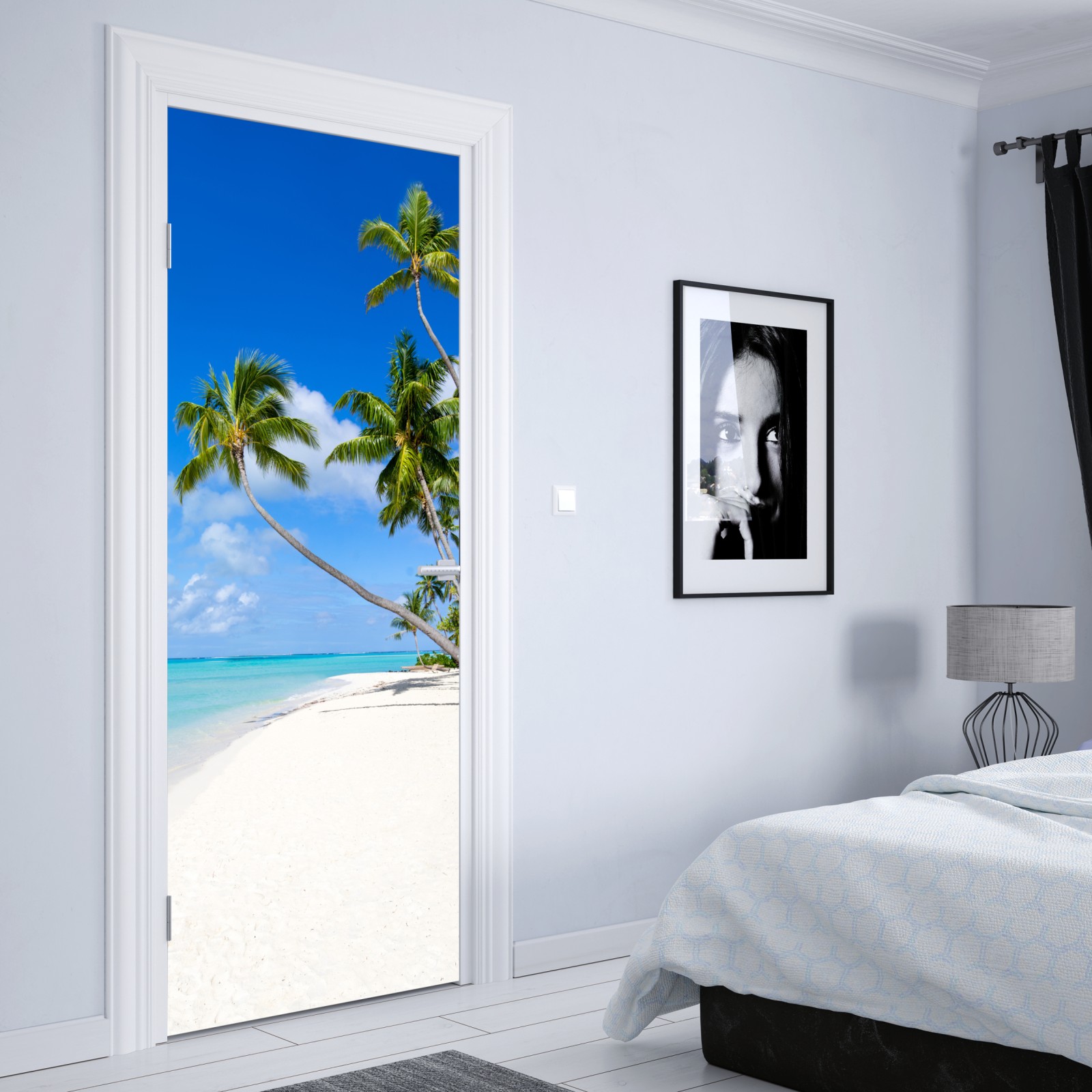 Bringen Sie Inselruhe in Ihr Zuhause mit dieser lebendigen tropischen Strandaufnahme mit wiegenden Palmen, türkisfarbenem Wasser und makellosem weißen Sand.