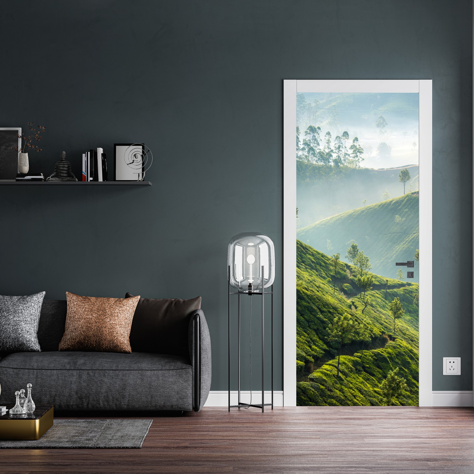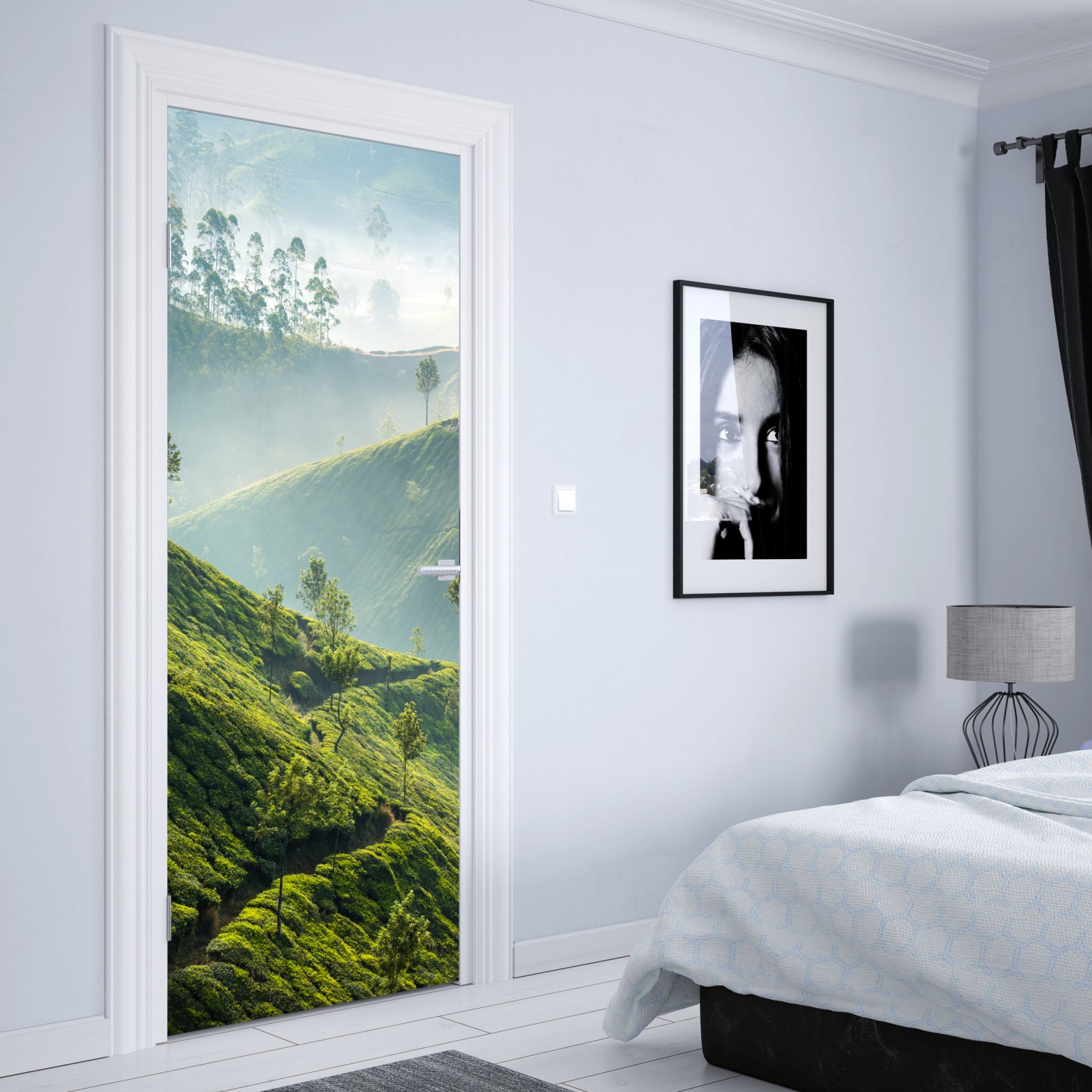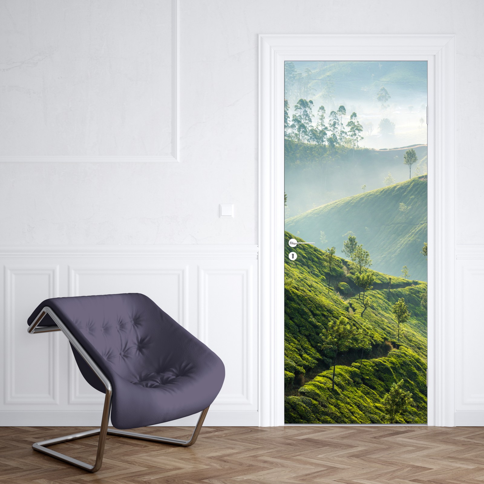 Türaufkleber neblige teeplantagen auf den hügeln von Munnar