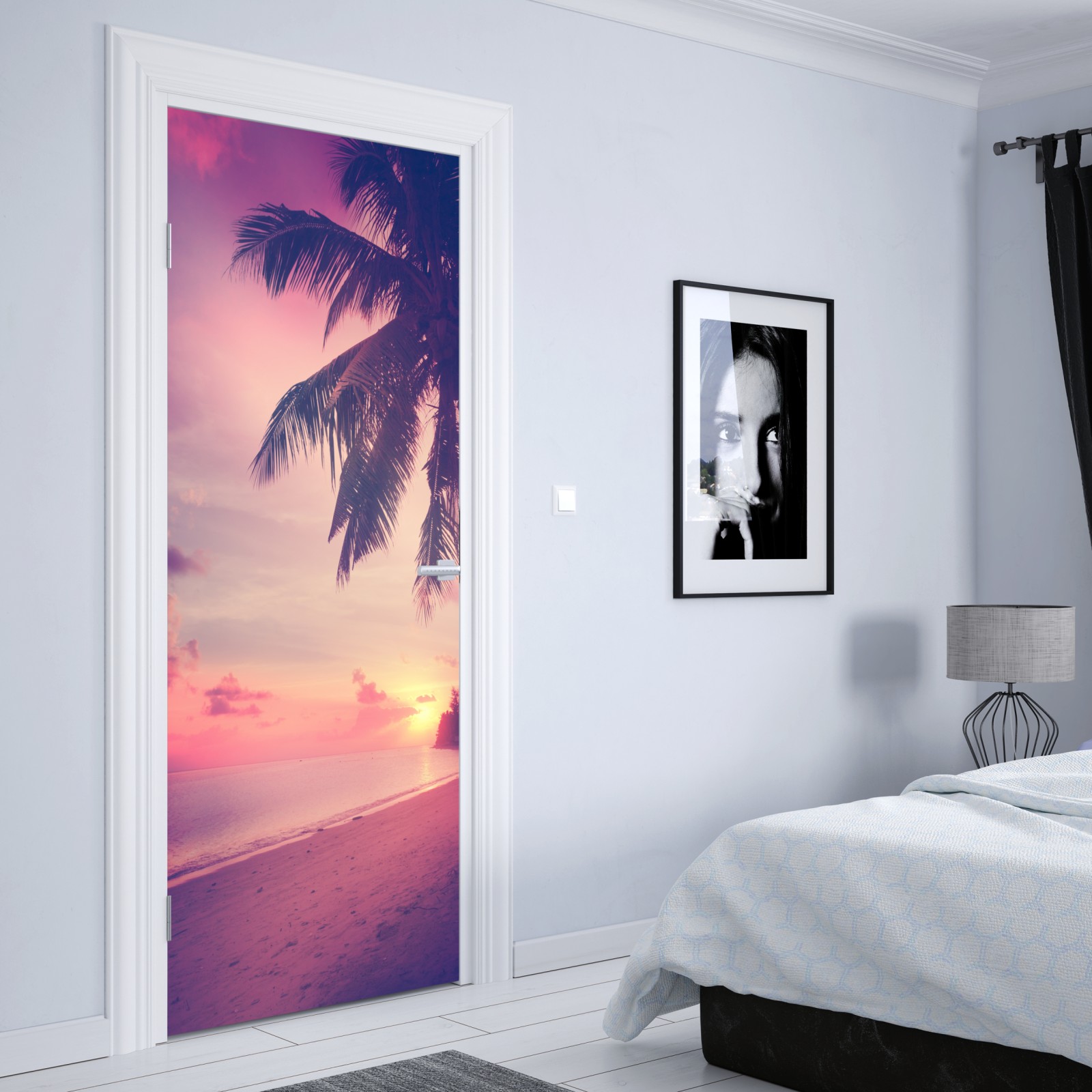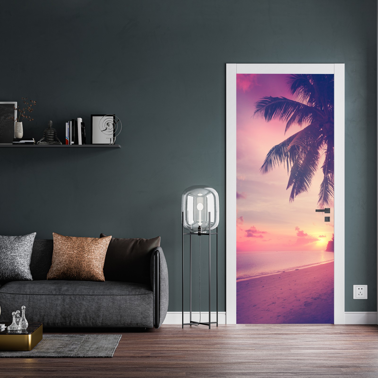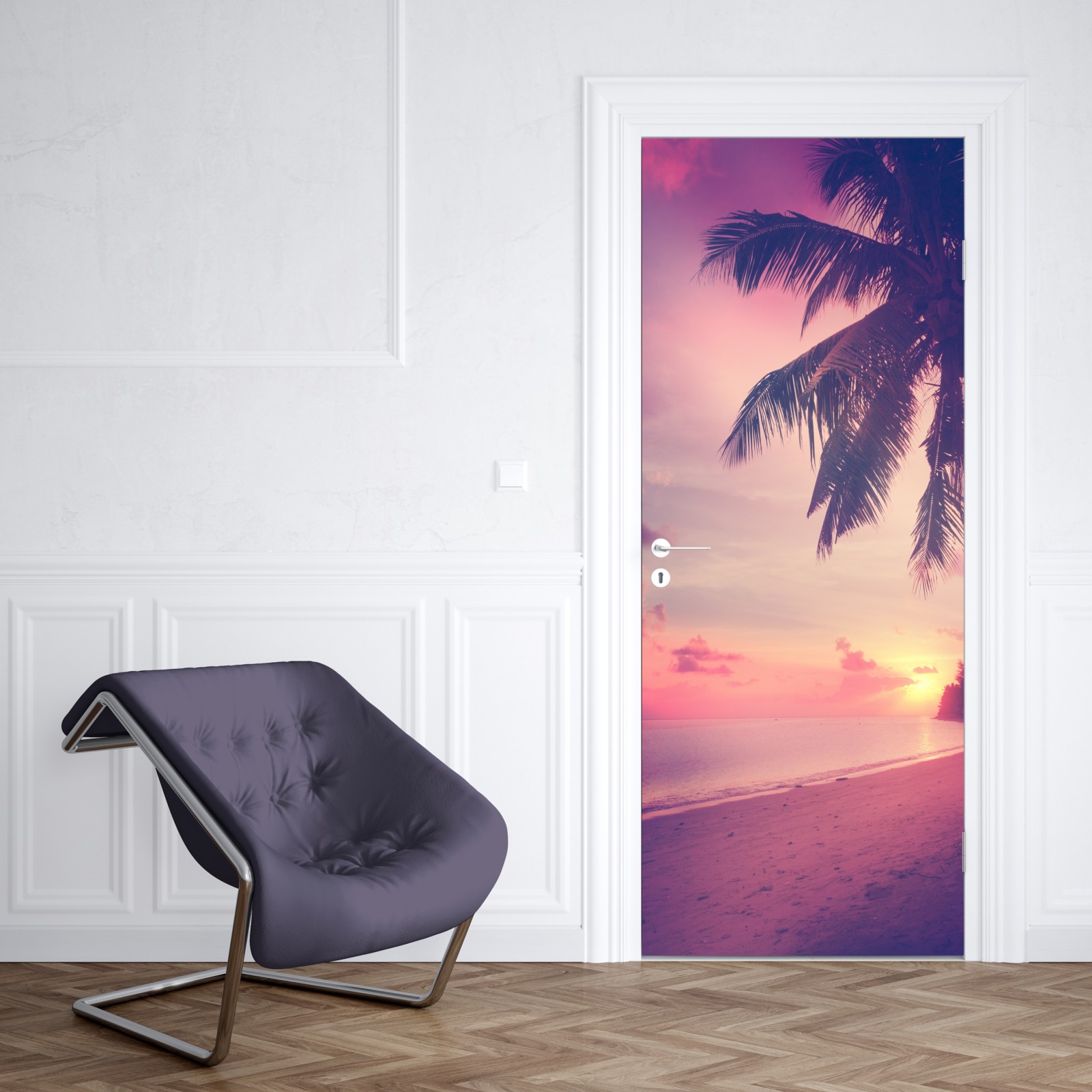Verleihe deinem Raum warme, tropische Atmosphäre mit diesem Retro-Strandbild mit Palm-Silhouetten und sanften Pastelltönen.