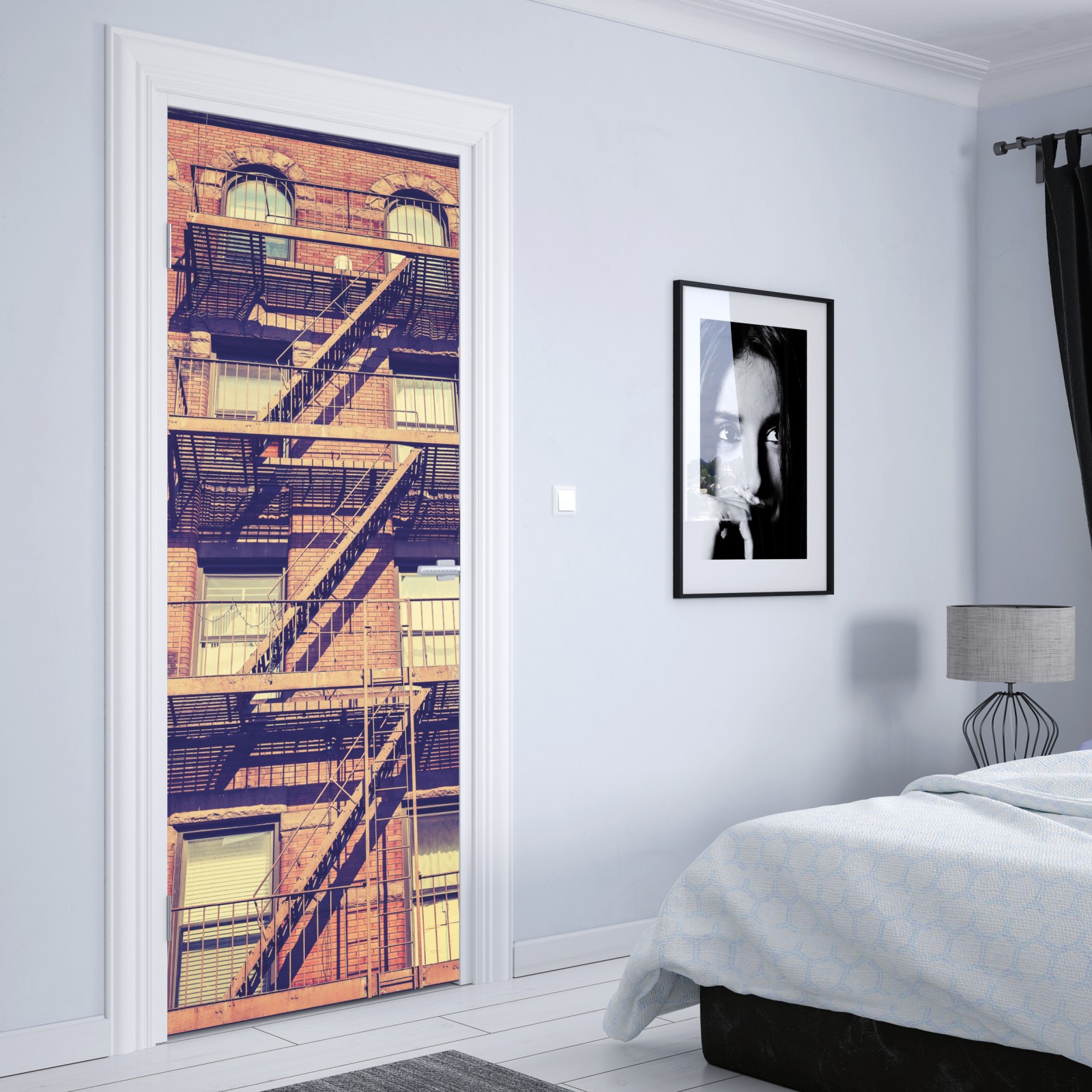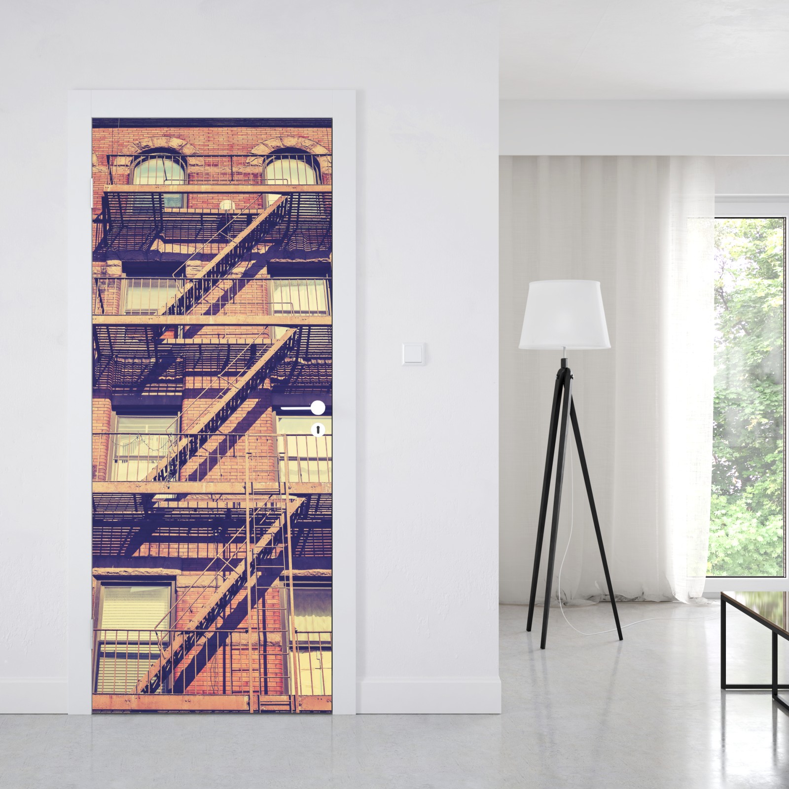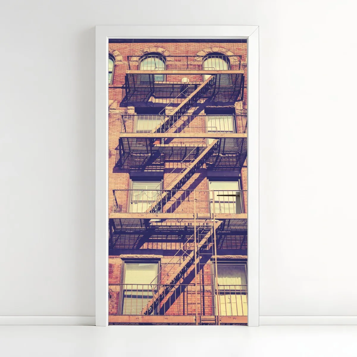 Bringen Sie klassischen urbanen Charme an Ihre Wände mit diesem vintage Foto von Feuertreppen an einer Backsteinfassade in New York.
