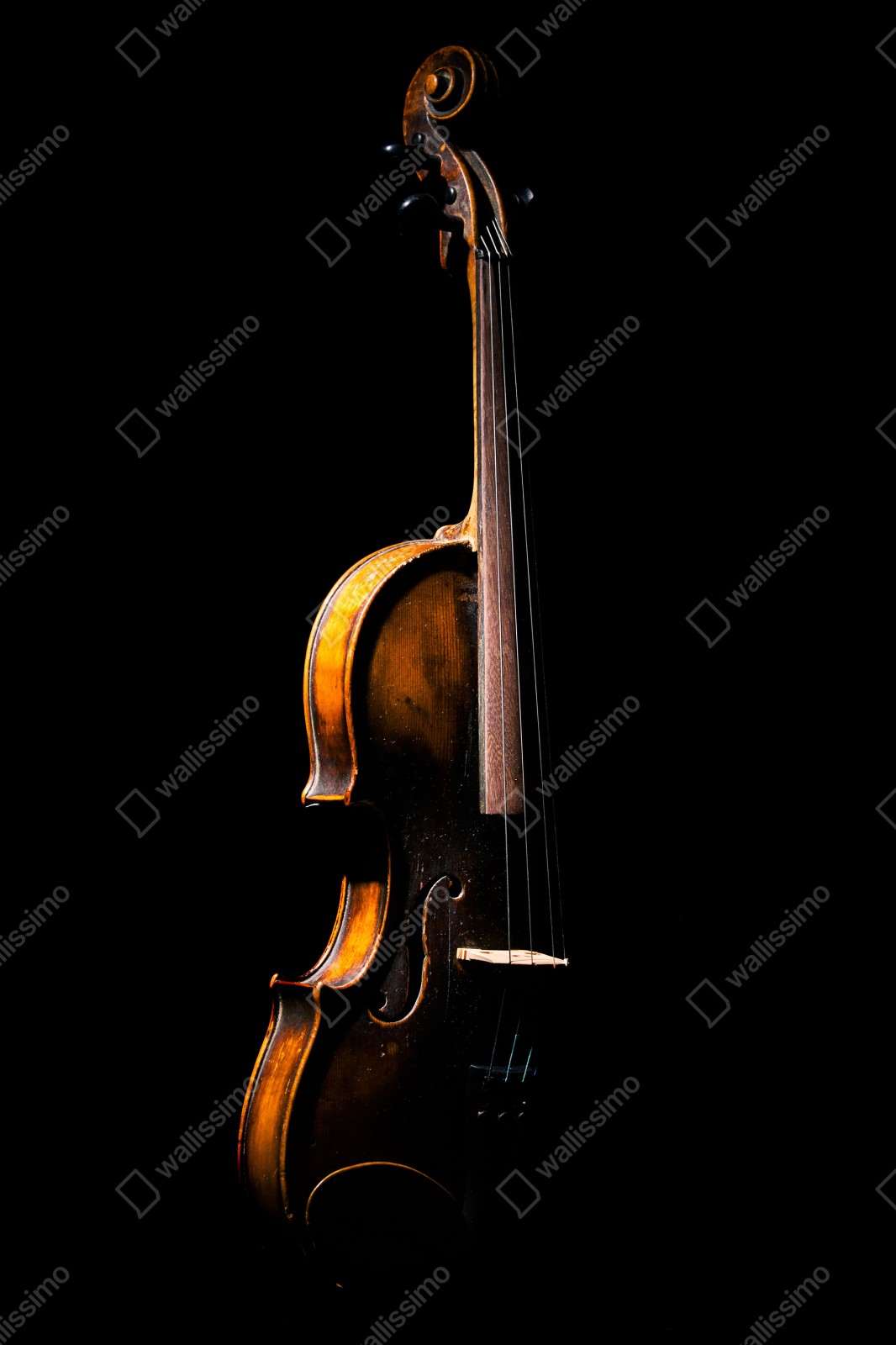 Verleihen Sie Ihrem Raum einen Hauch von Eleganz mit einer Aufnahme einer Vintage-Geige vor tiefschwarzem Hintergrund, ideal für Musikliebhaber und stilvolle Interieurs.