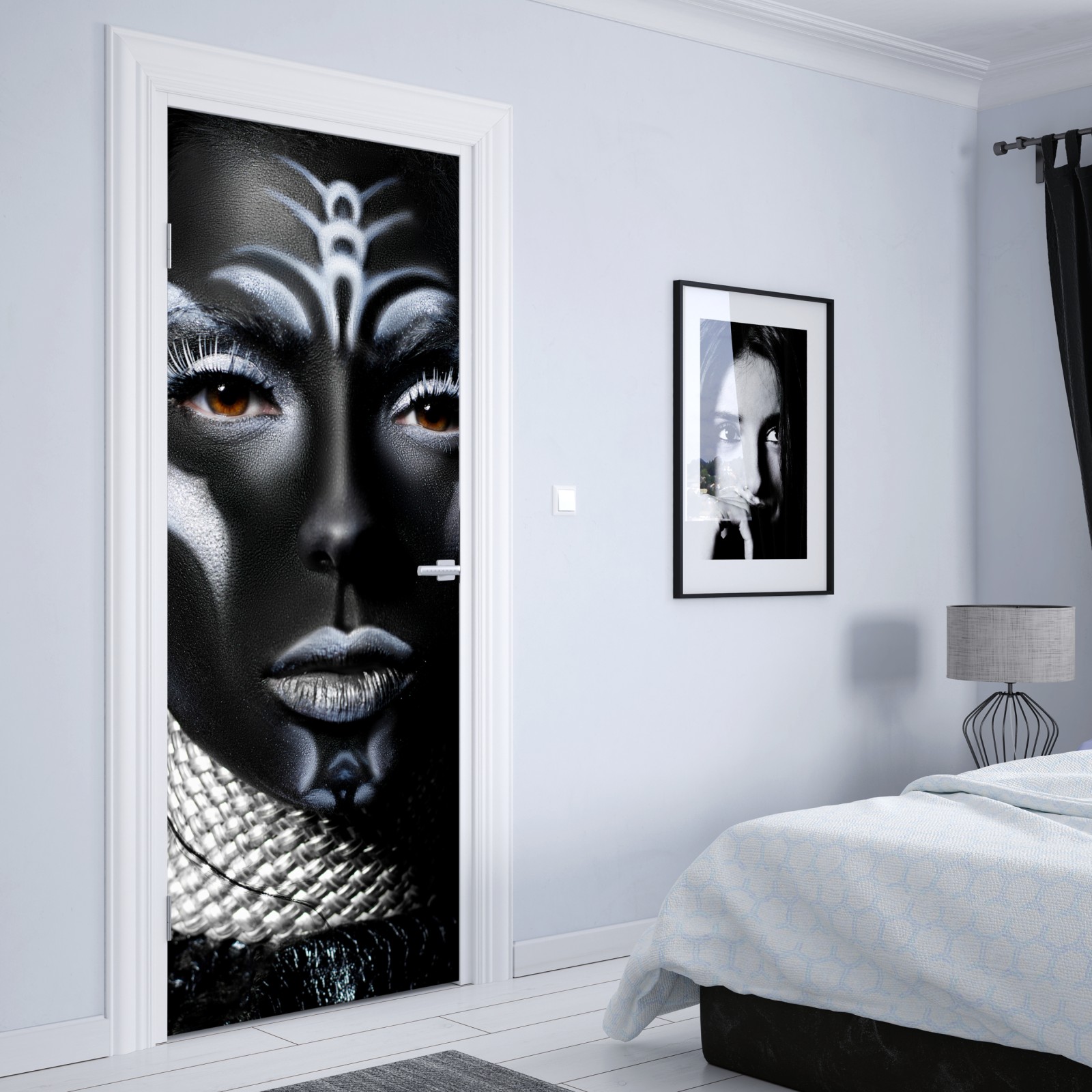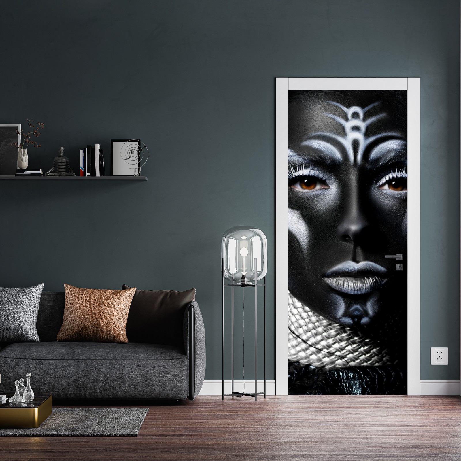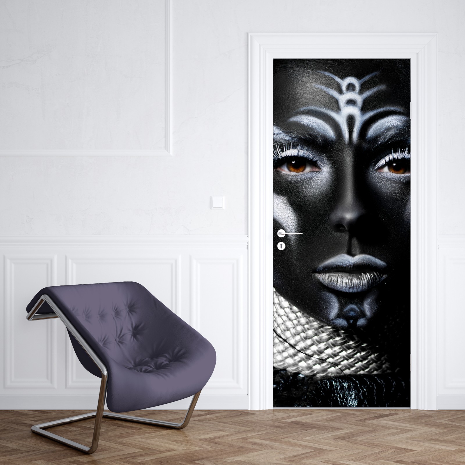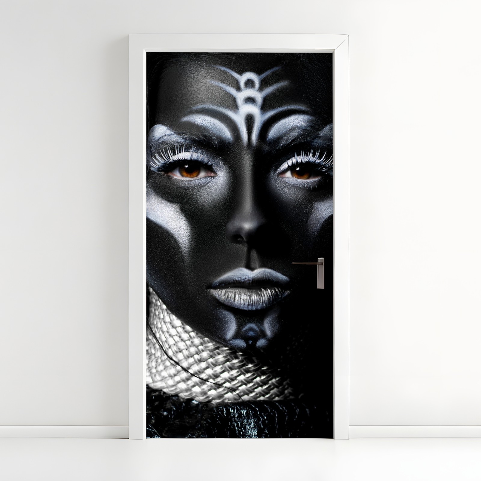 Ausdrucksstarkes Close-up mit dramatischer schwarzer Körperbemalung und kontrastierenden weißen Akzenten, perfekt für moderne Innenräume.