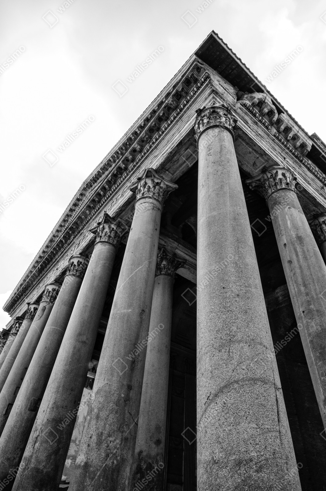 Verleihen Sie Ihrem Raum eine dramatische schwarz-weiße Ansicht der monumentalen Säulen des Pantheon in Rom, ideal für moderne, minimalistische Einrichtungen.
