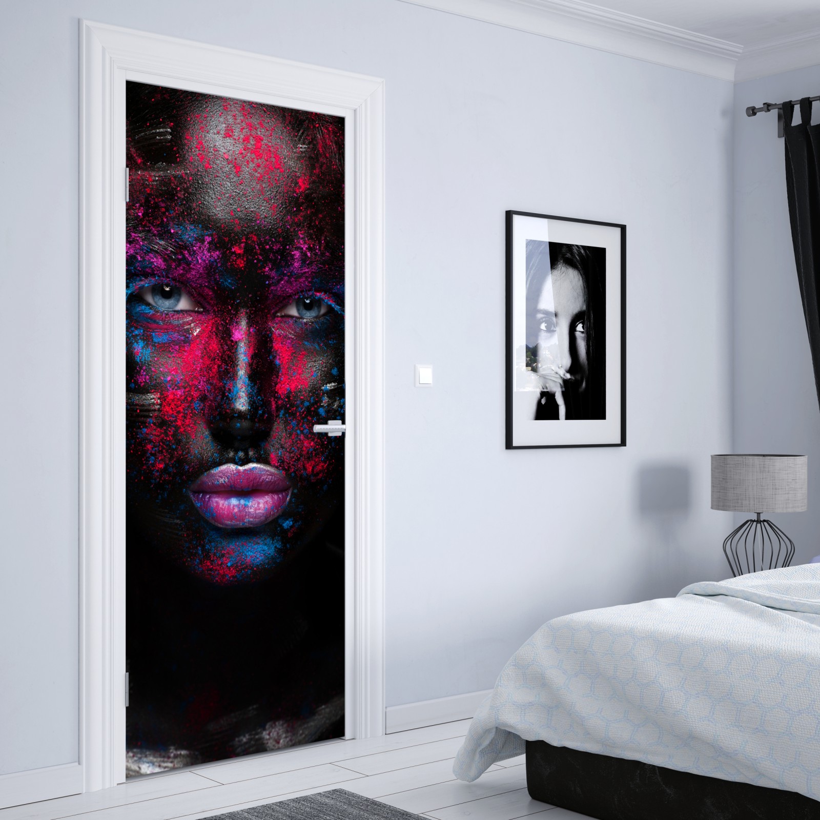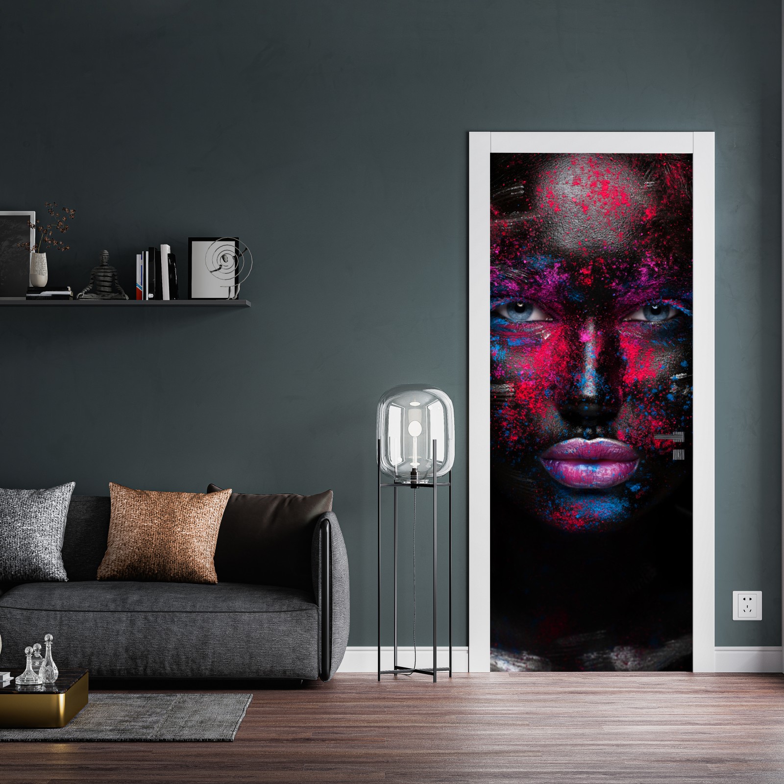 Bringen Sie kräftige Farben und modernen Charakter in Ihren Raum mit diesem dramatischen Neon-Gesichtsporträt vor tiefschwarzem Hintergrund.