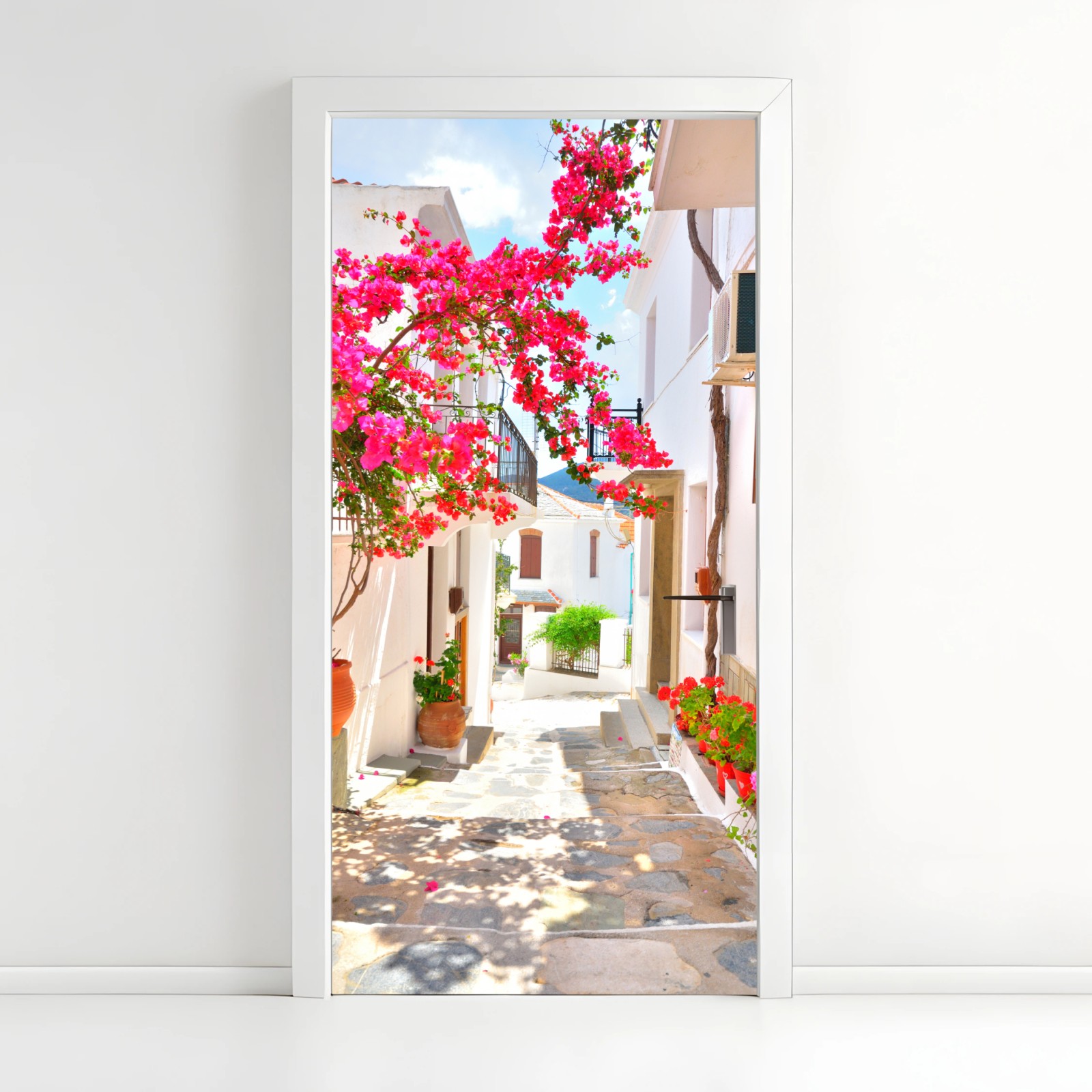 Türaufkleber Sonnige mediterrane gasse mit bougainvillea
