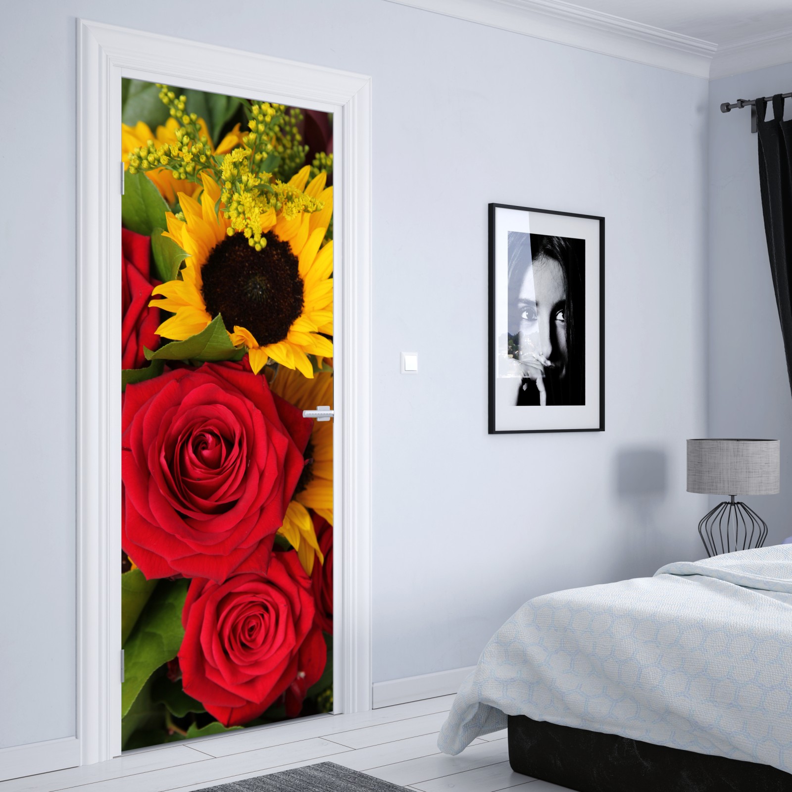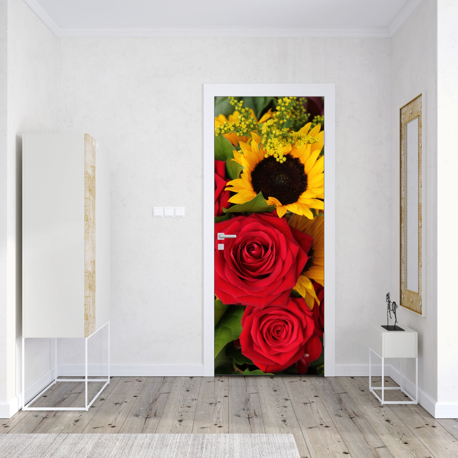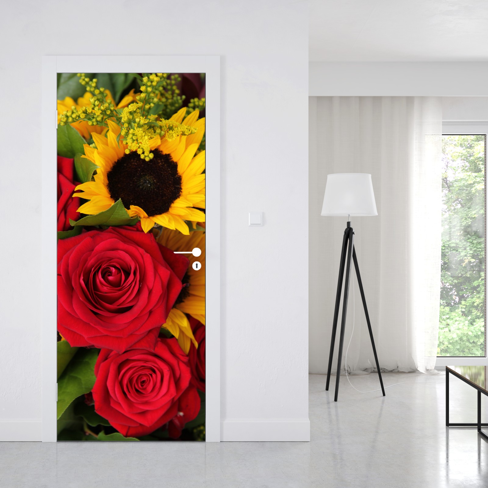 Türaufkleber rote rosen und sonnenblumen im bukett