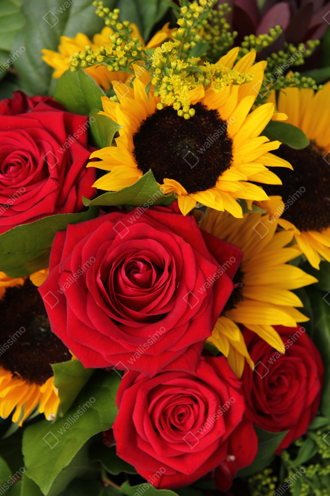 Bringen Sie lebendige Stimmung in Ihr Zuhause mit einer Nahaufnahme von roten Rosen und Sonnenblumen in einem üppigen Bouquet.