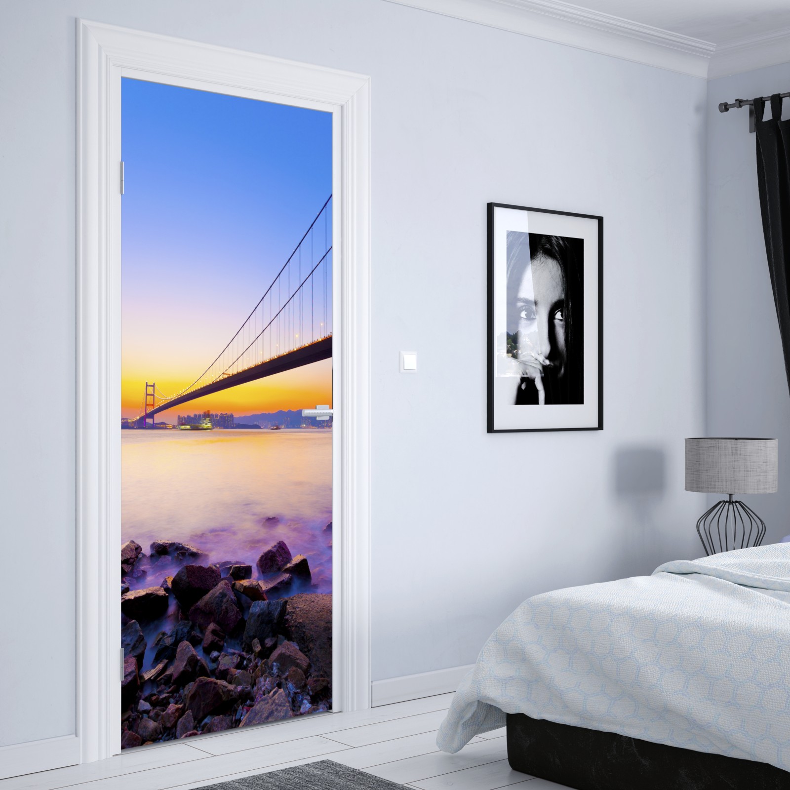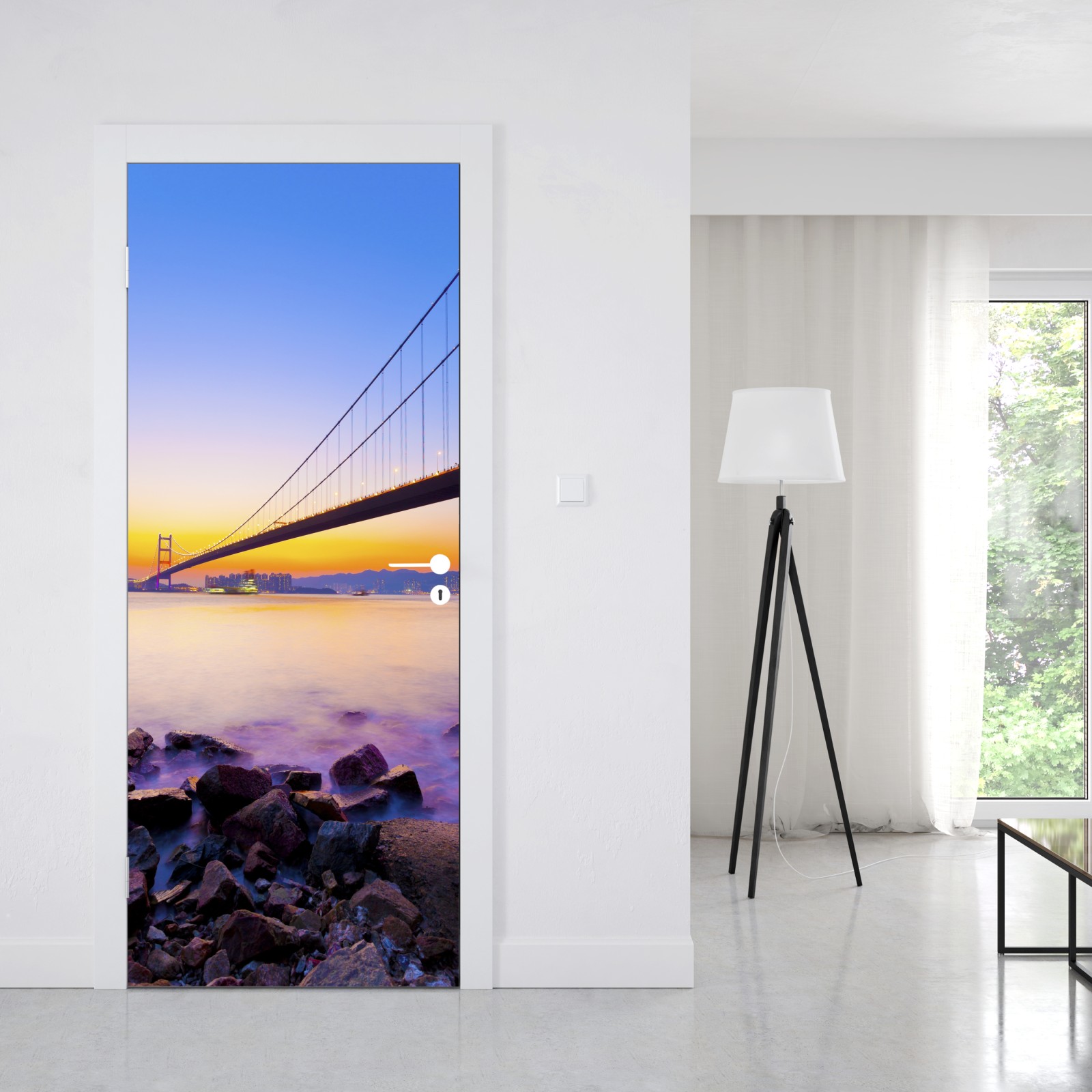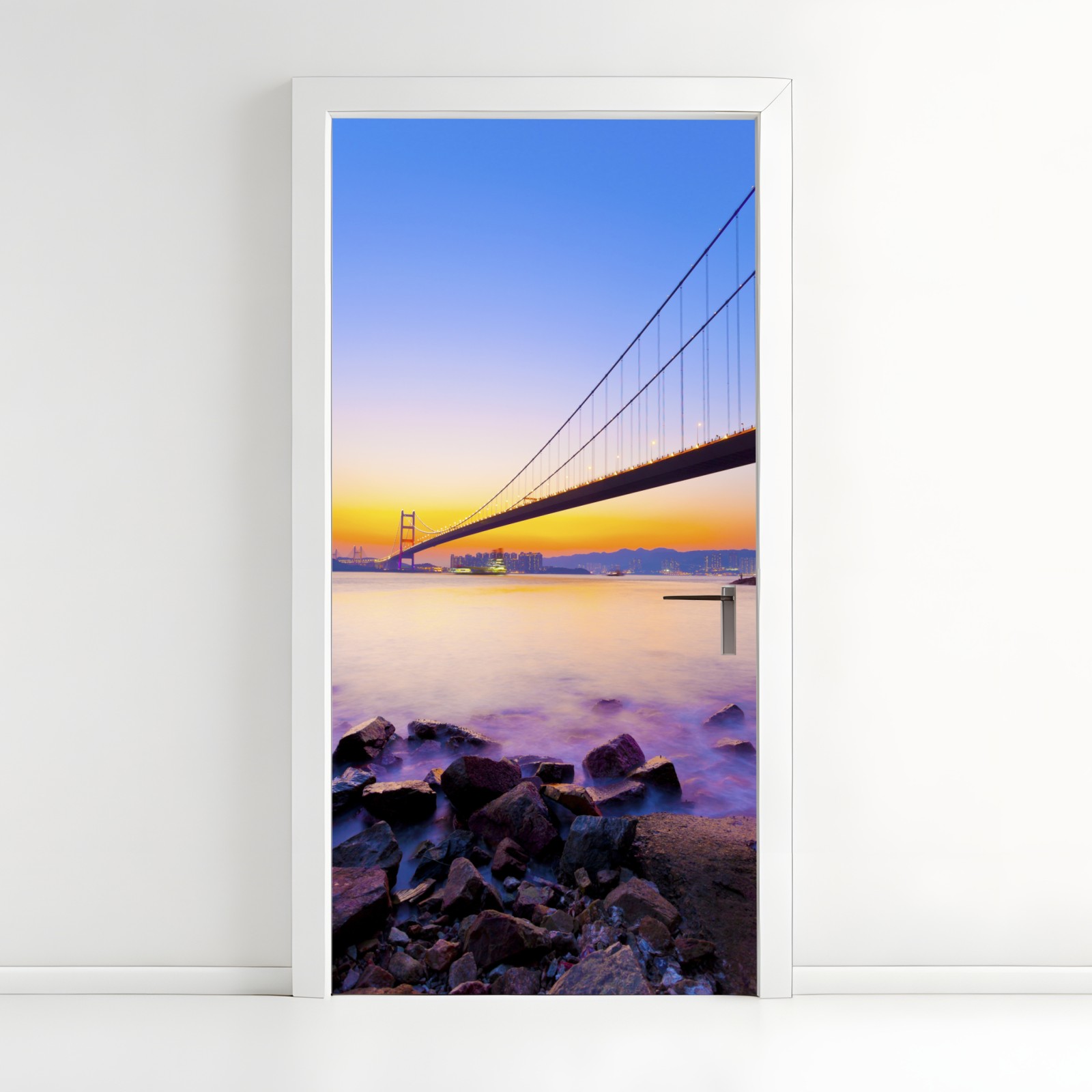 Türaufkleber goldener sonnenuntergang über hängebrücke