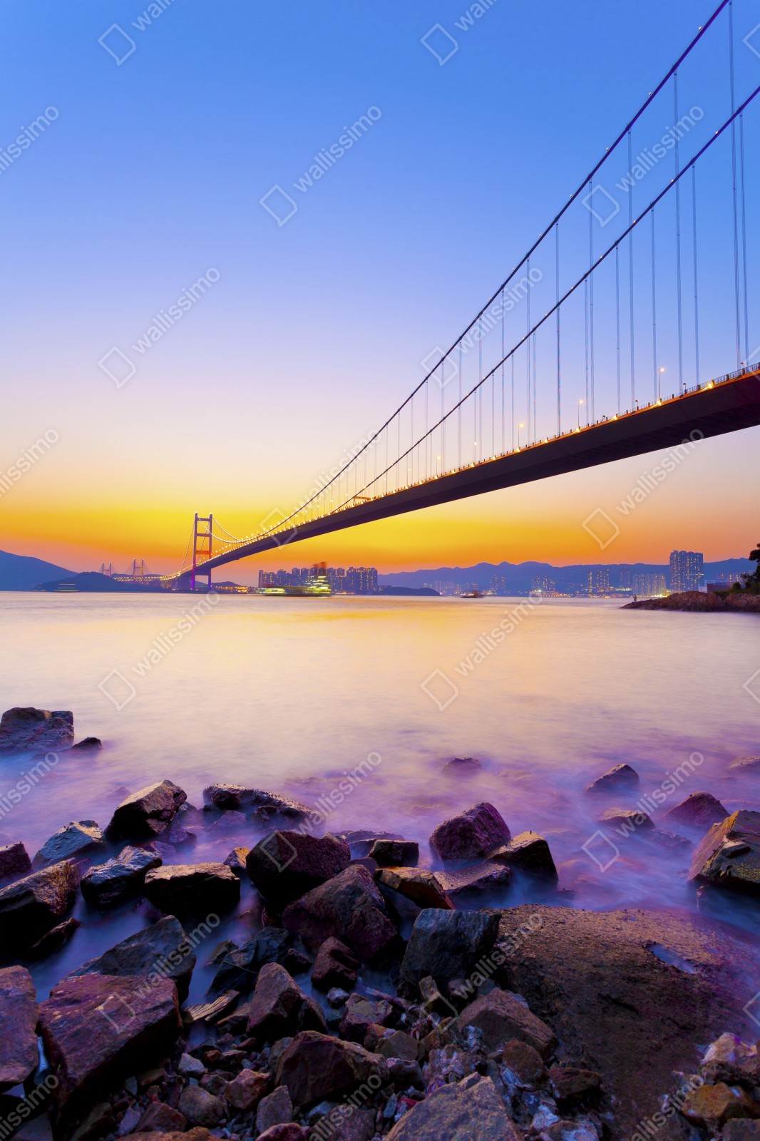 Erleben Sie ruhige Küstenstimmung mit einer dramatischen Hängebrücke bei Sonnenuntergang, die warme Farbtöne und sanftes Wasser in Ihr Zuhause bringt.