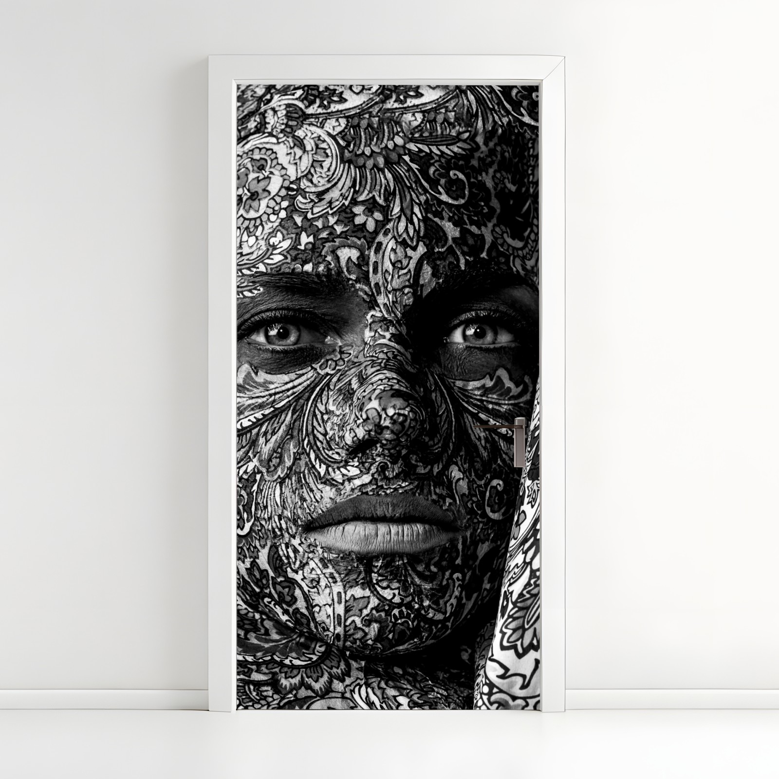 Fesselndes monochromes Porträt, das filigrane florale Muster mit menschlichem Ausdruck verbindet und sich perfekt als eindrucksvolle Wanddekoration eignet.