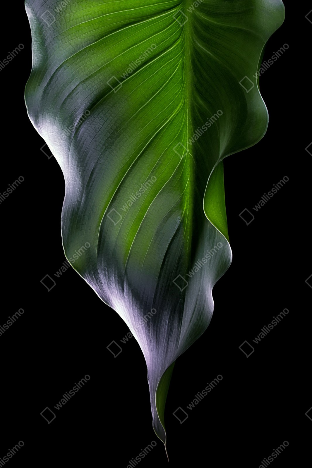 Bringen Sie Ruhe und natürliche Schönheit in Ihren Raum mit dieser eleganten Nahaufnahme eines grünen Blattes vor schwarzem Hintergrund.