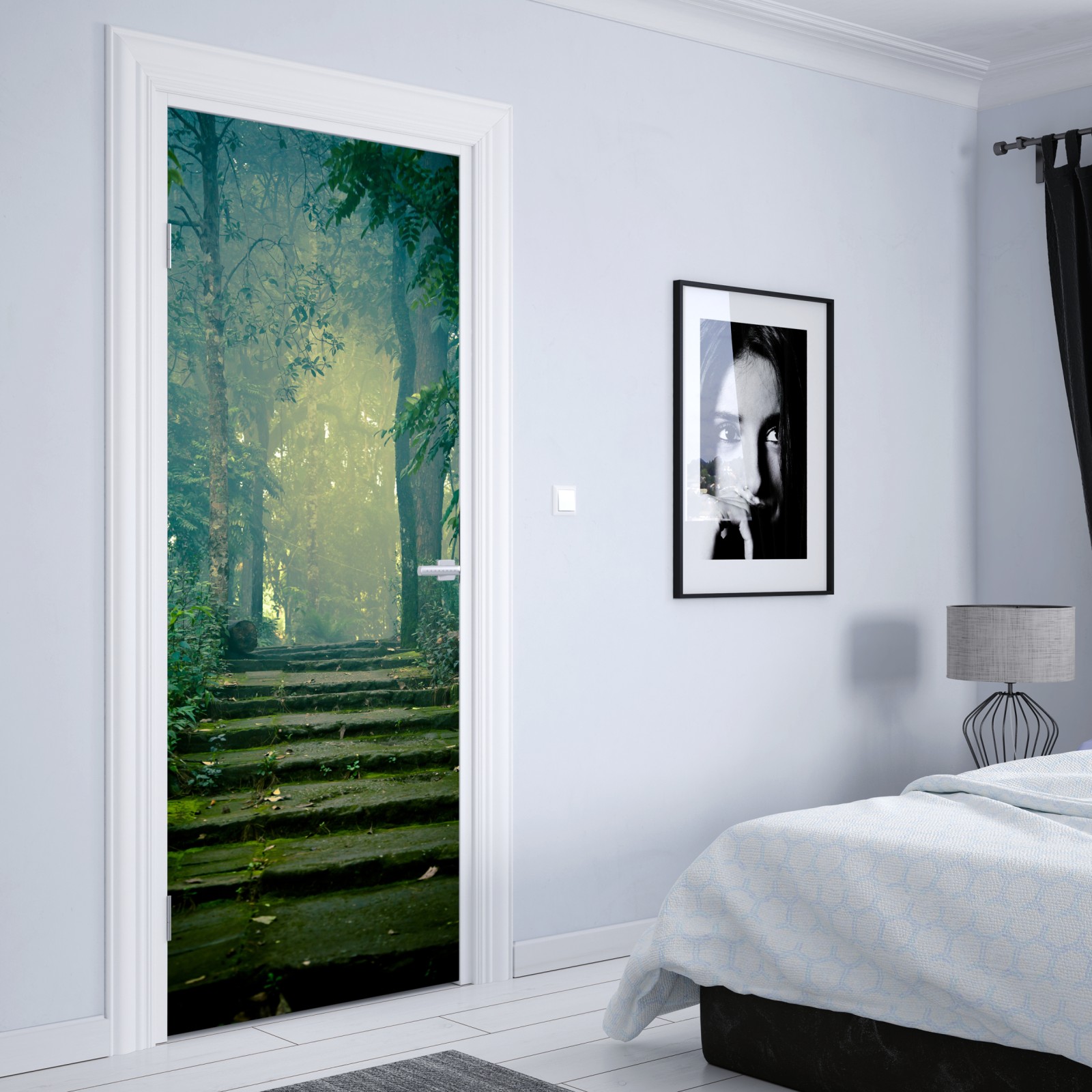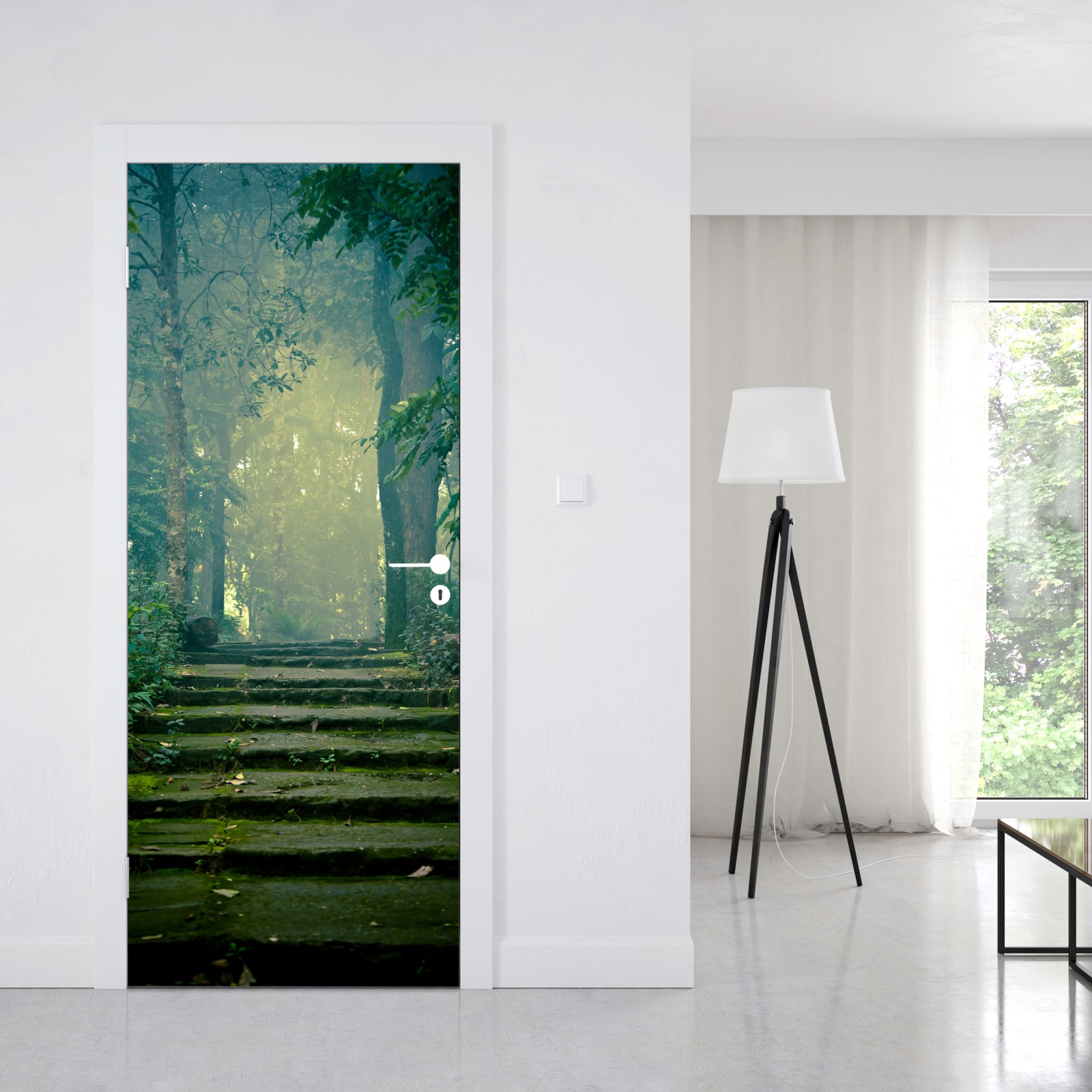 Türaufkleber moosbedeckte steintreppe in den nebligen wald