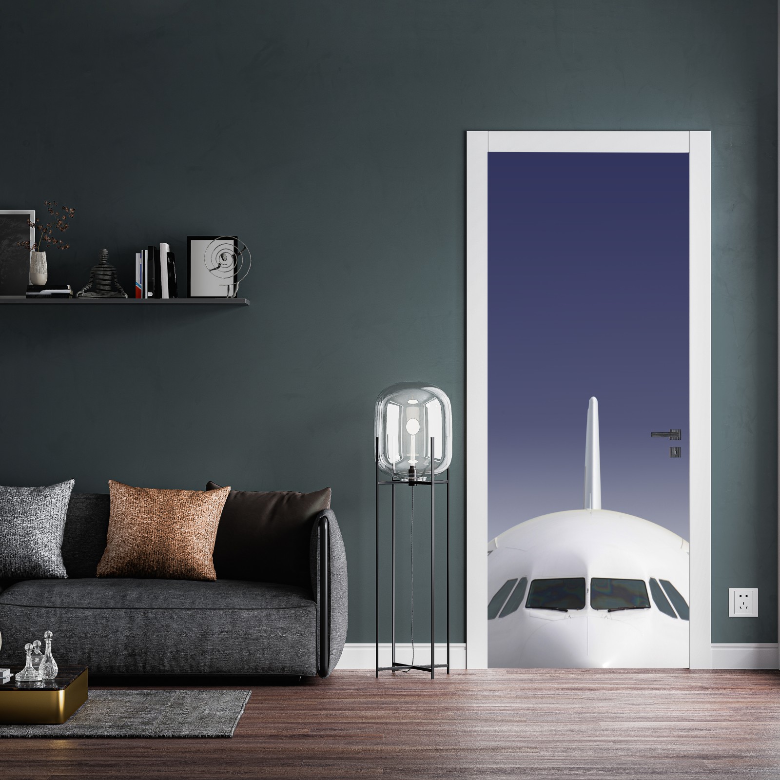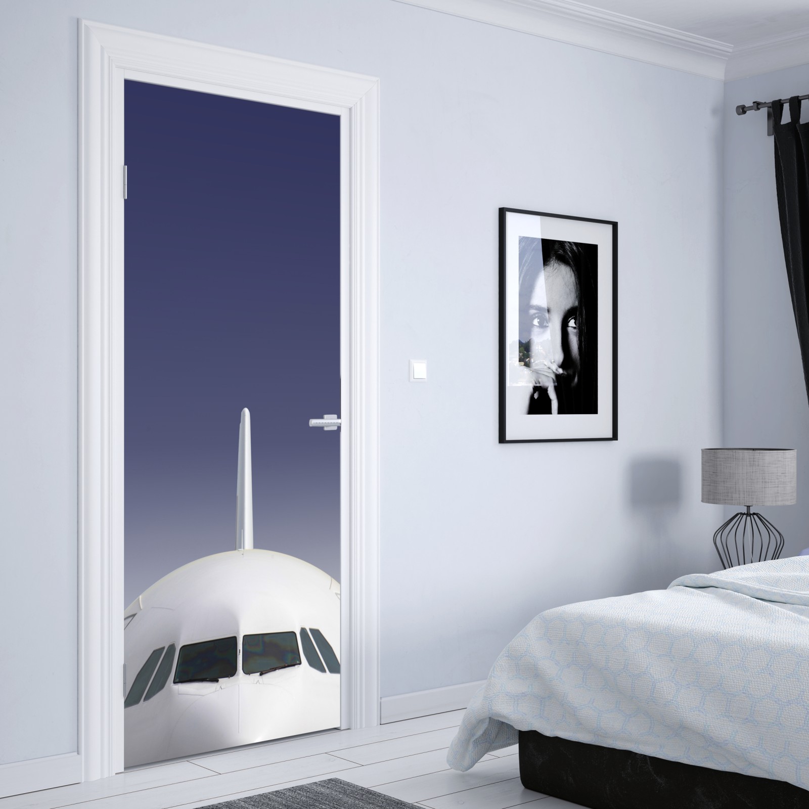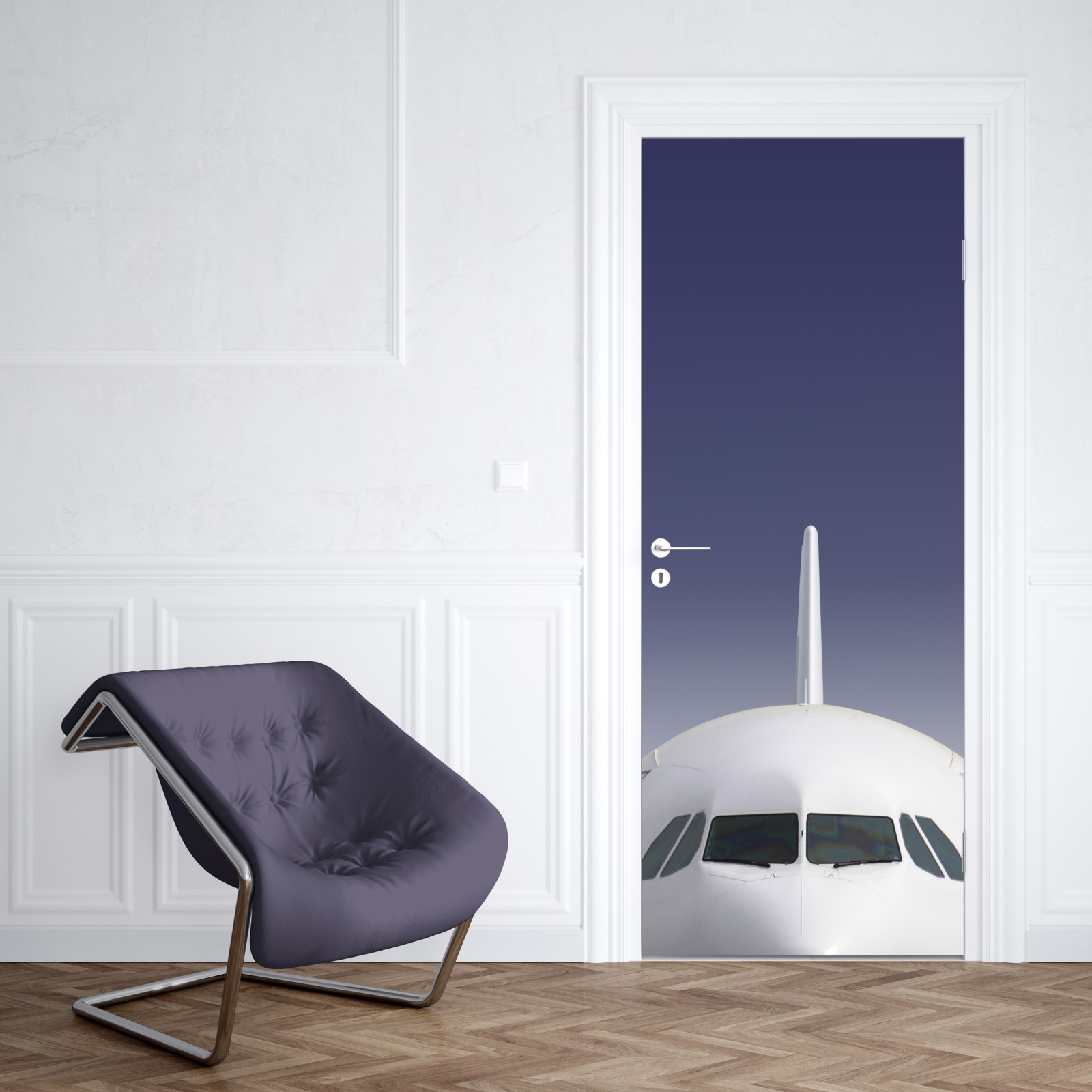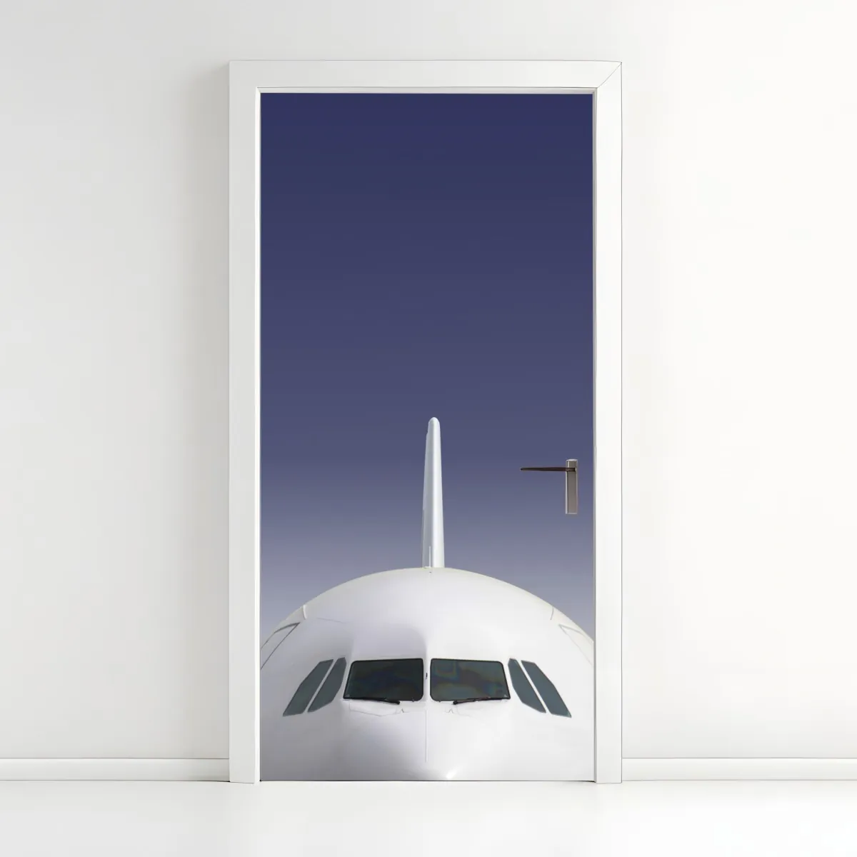 Türaufkleber frontansicht eines flugzeugs vor blauem himmel