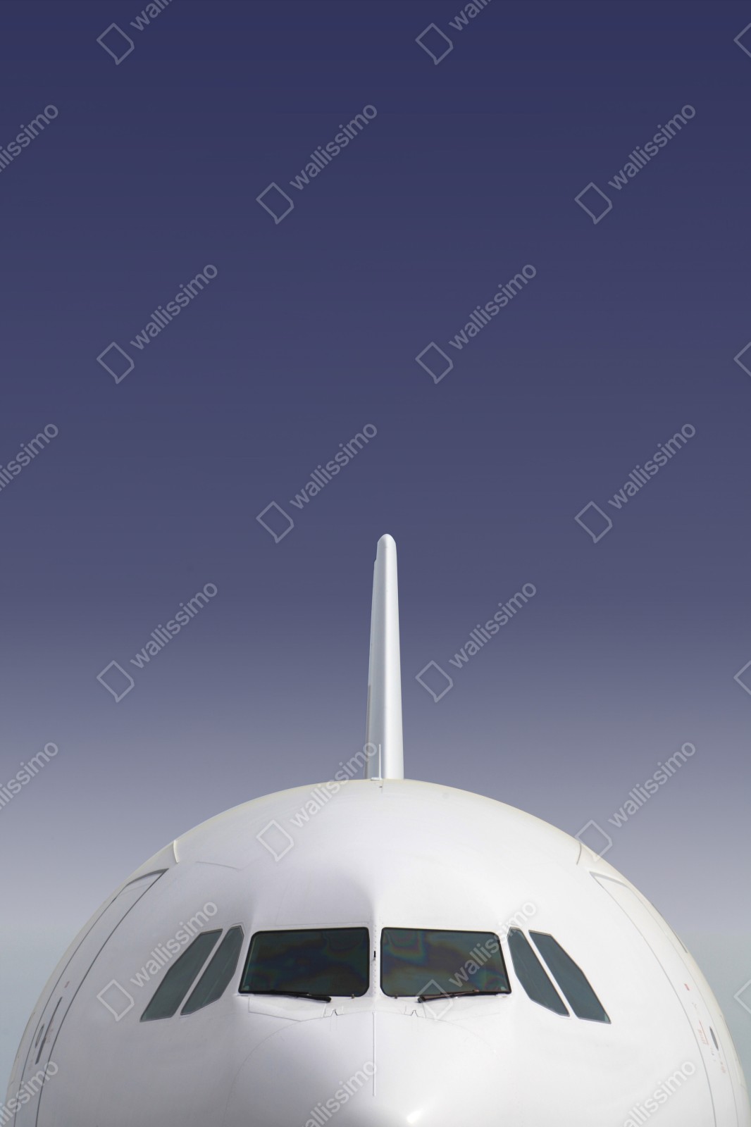 Klares frontales Bild eines modernen Flugzeugs vor ruhigem blauem Himmel, ideal für moderne Innenräume.